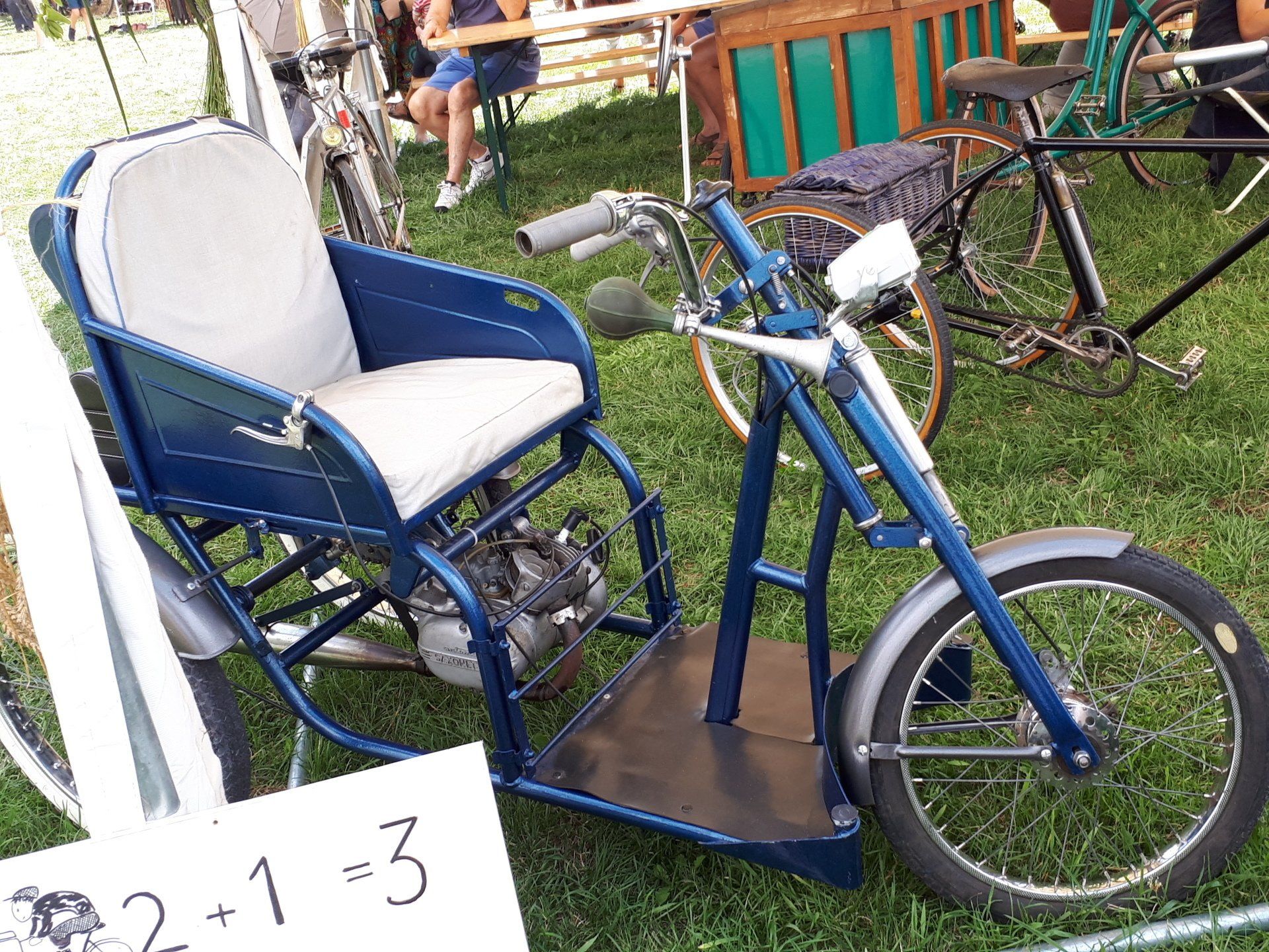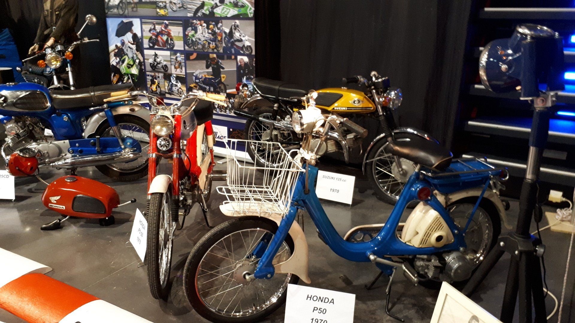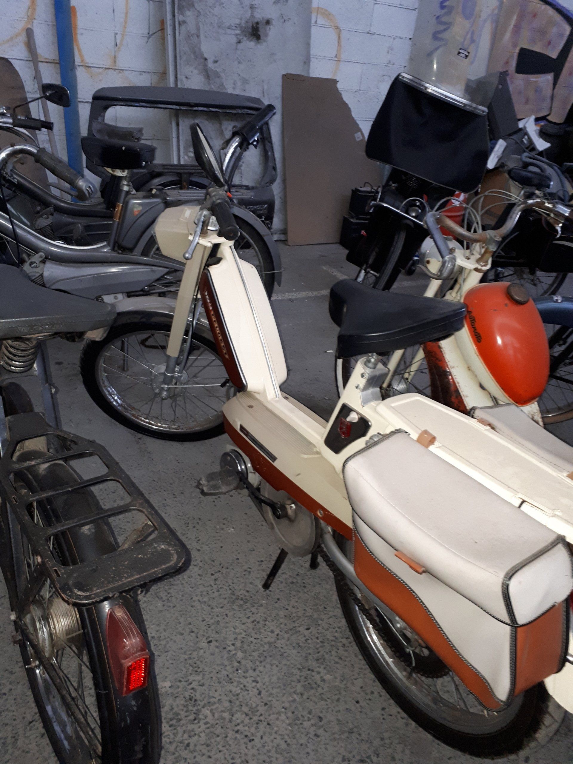 Nous exposons des engins des années 1980, tel que cette Bicimoto à moteur thermique LEM de 25cc, dont la vitesse de croisière n'excède pas les 25 km/h de quoi décoiffer un chauve.