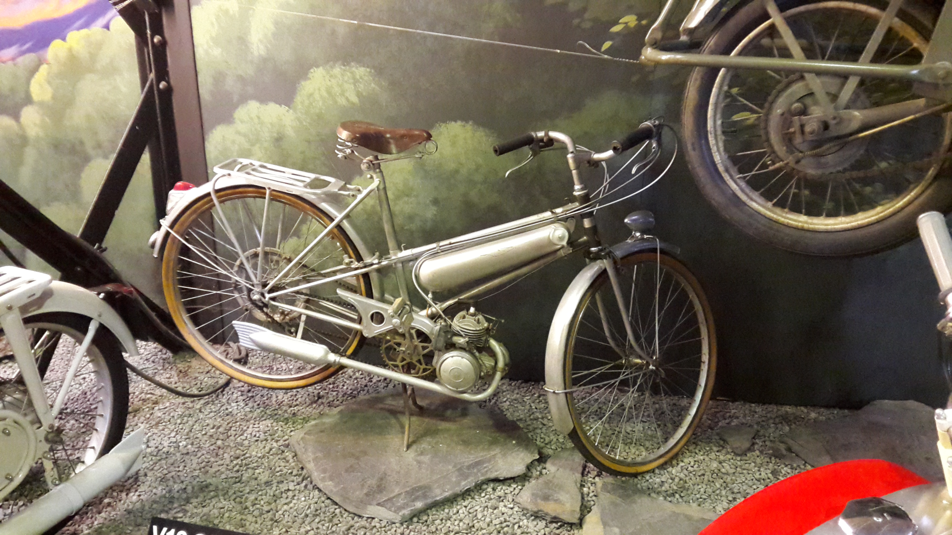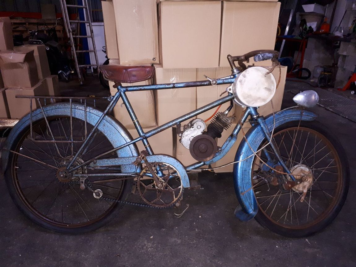 Nous exposons des engins des années 1980, tel que cette Bicimoto à moteur thermique LEM de 25cc, dont la vitesse de croisière n'excède pas les 25 km/h de quoi décoiffer un chauve.